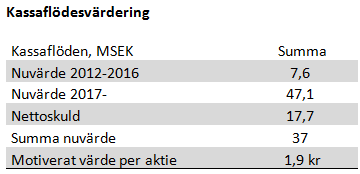 Ovan har vi räknat med att 40% av vinsten delas ut från och med 2014 (2013 års vinst), och beräknad WACC är 13%. Detta baseras på ett avkastningskrav på 5%, en riskpremie på 10% samt ett beta på 1,5. Vår riktkurs sätts till 1,9 SEK vilket innebär en potential på drygt 50%. Notera att detta enbart är baserat på potentiell utdelning och inte fritt kassaflöde.