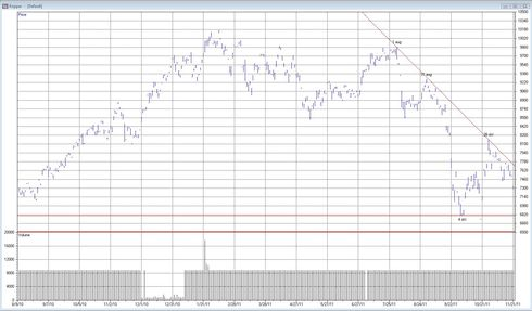 Som stöd framträder lågpunkterna runt den 4 oktober på 6 800 USD/ton som de viktigaste. Skulle dessa ge vika är det 6 500 USD/ton som är vårt nästa mål på nedsidan. Då vi det senaste halvåret ofta fått viktiga vändningar i samband med månadsbryten, kommer förstås tidpunkten i mitten av nästa vecka att bli extra intressant. En tydlig botten, helst ovanför 6 500 USD/ton, skulle vara en första signal på att även den fallande trendlinjen kommer att få ge vika under december och nya långsiktiga uppgångar kan därefter påbörjas.