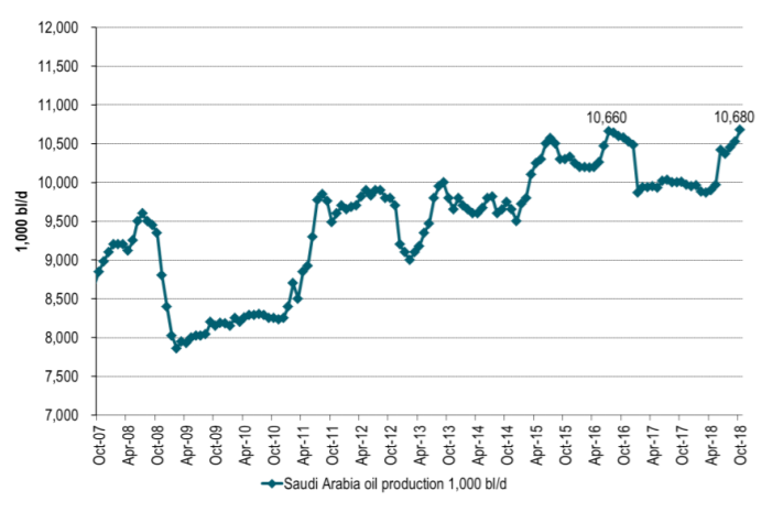 Ch3: Saudi Arabia at all-time-high in October. Saudi can easily reduce production a little to maintain USD 70/bl. Even with this high production by Saudi Arabia in October the weekly inventory data have been drawing down strongly over the past three weeks!