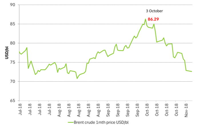 By then the speculative driven sell-off centred on US stock building will have come to an end. Iran oil sanctions will increasingly start to show in global inventory draw down in the second half of November. The normal seasonal November dollar rally will start to fade. Saudi Arabia will no longer need to pay tribute to Donald Trump’s whish for a lower oil price leading up to the US mid-term election (on Nov 6). We expect Saudi Arabia or a proxy of Saudi through some of its allies to verbally intervene in the oil market shortly after US mid-term painting a clear picture that: “Brent crude has NO business below USD 70/bl. Saudi Arabia produced at the highest level ever of 10.68 m bl/d in October and will undoubtedly pull back as needed to keep Brent above the USD 70/bl line. A brief visit to high USD 60ies/bl is of course possible on the back of normal market fluctuations. Do take note that US + EU + Sing + Floating weekly data have drawn down strongly over the past three weeks. In total 37 m bl.