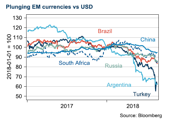 If the Turkish currency crisis is not staved off, the risk of a financial system meltdown and, ultimately, a government debt default is high. But even though Spanish banks are vulnerable, Turkey’s problems should not hurt the overall eurozone economy to a significant degree. Euro weakness and European stock market declines due to the escalation of Turkey’s crisis therefore seem to be overdone. However, Turkey is far from out of the woods yet and the situation might need to worsen still to convince Turkey to adopt a painful, but more sustainable, path toward regaining financial markets’ trust. Other emerging markets with similar challenges, such as South Africa, Argentina and Pakistan, also face tough times ahead.