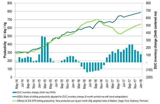 The US EIA yesterday released its monthly drilling productivity report as well as its DUC report (showing the number of drilled and completed wells). The reports show that US shale oil production will grow at a marginal annualized pace of 1.3 m bl/d in March while it has been growing at 1.5 m bl/d on average since July 2017. Using the latest drilling data update from the US EIA in combination with its recent STEO forecast for US crude production for 2018 we get a likely US crude oil production of 10.8 to 10.9 m bl/d for 2018 assuming US shale oil will grow between 110 to 130 k bl/d/mth in 2018. Rig count, well completions, DUCs and volume productivity are all rising. In productivity adjusted terms the well completions in January 2018 stood 35% above the average monthly completions in 2014.