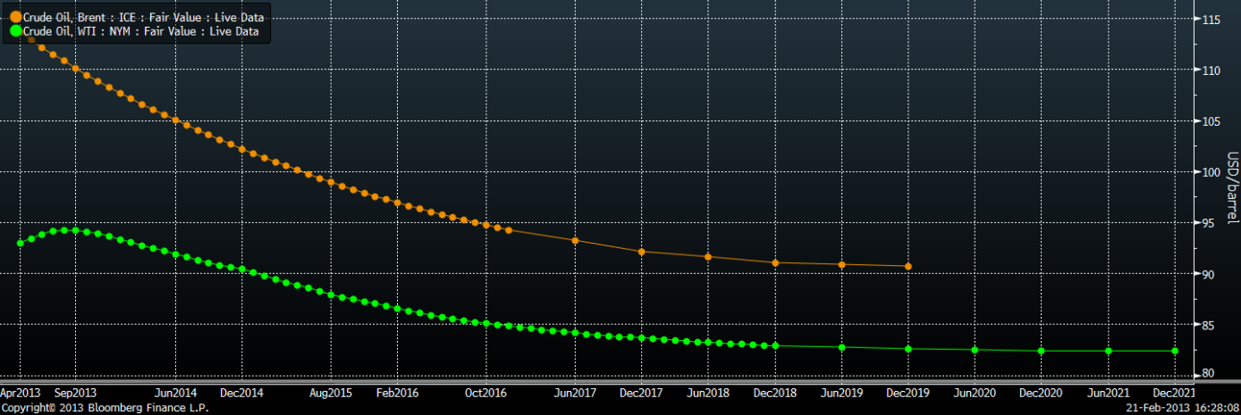 Medan priset på Brent har stigit så ser vi att spreaden Brent-WTI har minskat längre fram i terminskurvan. Under de senaste åren har priserna på WTI och Brent gått isär, med en genomsnittlig rabatt på WTI på 17,47 USD per fat under 2012. I och med att oljelagren i Cushing har minskat som en följd av utbyggnaden av Seaway-ledningen förväntas rabatten på WTI i förhållande till Brent att komma att minska under de kommande månaderna.