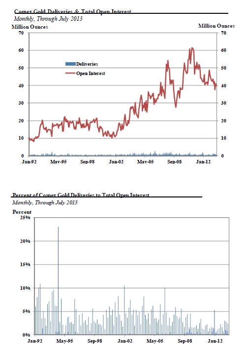 These claims cannot be further from the truth. First, registered stocks account for less than a third of total Comex reported gold stocks. While registered stocks have fallen sharply, combined registered and eligible stocks declined at a far less dramatic pace of 14.3% from end of April to 6,967,251 ounces as of 15 August. More importantly, monthly data from the Comex shows that there is a greater ‘cover’ of inventories as a percentage of open interest than there was historically. In July the percentage of open interest backed by total Comex gold inventories stood at 17.5%. While this percentage has been declining since reaching 28.0% in March 2012, stocks are equivalent to a vastly higher percentage of open interest than the period from January 1985 to April 2004, during which time the average was 12.0%. In fact, for much of the past decade the percentage of open interest covered by total stocks was much lower. It moved in a range of 6.1% – 16.8% between August 2000 and April 2004, and dipped to as low as 13.6% as recently as December 2007.