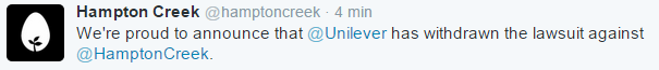 Uppdatering: Ett knappt halvt dygn efter att vi publicerade denna artikel twittrar Hampton Creek att Unilever har dragit tillbaka sin stämning.