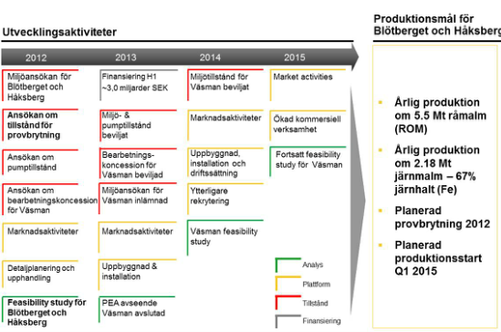 I dag har Nordic Iron Ore två stycken huvudprojekt, varav två är så kallade brownfield-projekt, sådana fyndigheter som övergetts av en tidigare prospektör eller operatör. Det betyder att sådana fyndigheter ofta har en betydligt lägre risk eftersom det sedan tidigare är känt att det funnits kommersiellt utvinningsbara mängder av den aktuella råvaran. I detta fall är det SSAB som varit en tidigare operatör, men som 1980 valde att stänga ned gruvproduktionen som en följd av det då betydligt lägre priset på stål som så gott som all järnmalm vidareförädlas till. I dag är priset på såväl järnmalm som slutprodukten stål betydligt högre, vilket gör att ledningen för Nordic Iron Ore räknar med att bolaget redan under det första kvartalet 2015 skall kunna vara i produktion. 2015 kan låta som långt bort, cirka tre år, men för att vara ett gruvprojekt, även om det är ett så kallat brownfield-projekt, så är det ganska normalt med utvecklingstider på mellan åtta och femton år varför detta projekt får anses ha varit tämligen snabbt utvecklat.