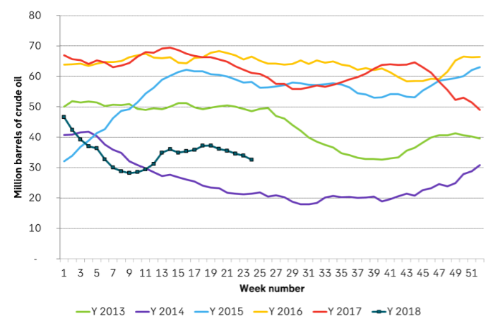 US refineries will now run close to max capacity all through July and August which will help to draw down US crude oil inventories. US Cushing Oklahoma crude stocks have already been drawing down for five weeks in a row and this trend now seems likely to continue through July and August.
