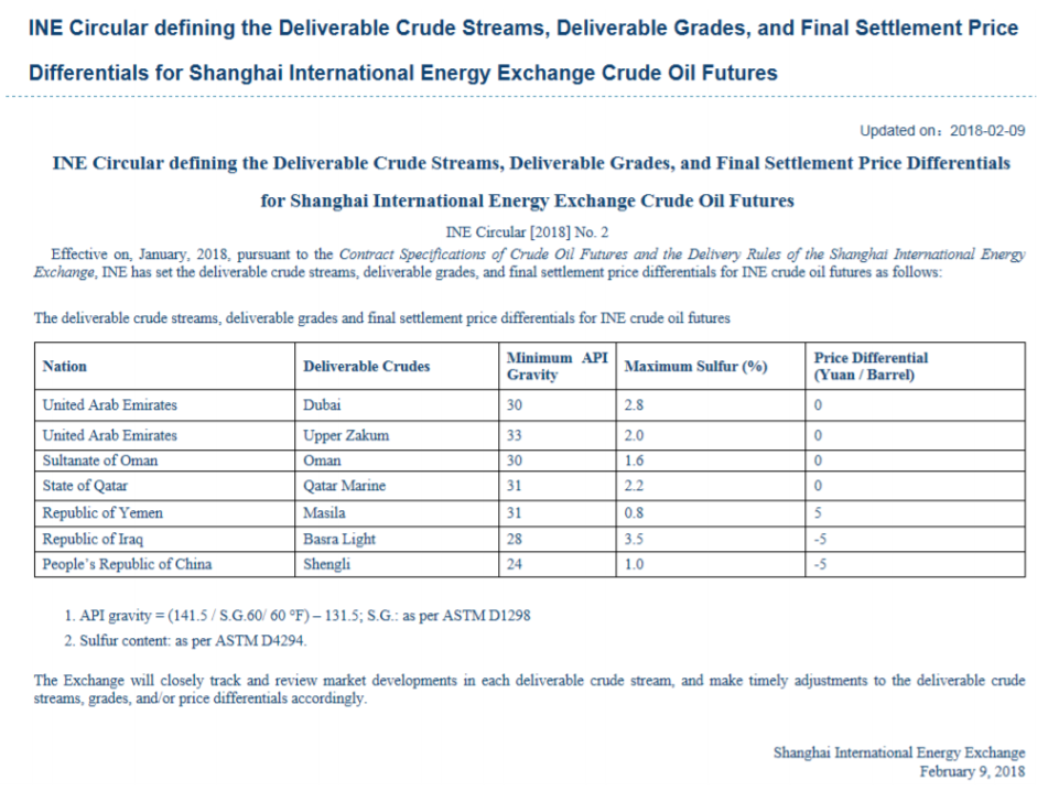 Seven deliverable crude streams in Shanghai will be used to settle the INE crude oil contract. They originate from UAE, Oman, Qatar, Yemen and China itself. The crude streams are distinctly different from the light, sweet crude benchmarks of Brent crude and WTI. The INE crude streams are on average (across the different grades) required to have an API gravity of more than 29.6 and a sulphur content of less than 2%. In comparison the WTI benchmark is very light with an API of 39.6 and only about 0.24% sulphur. As such the INE benchmark is distinctly different from both Brent crude and WTI. It is however very close to the Dubai crude oil marker which has an API of 31 and a sulphur content of 2%. As such one could say that the INE contract is the Dubai marker in Asia quoted in renminbi.