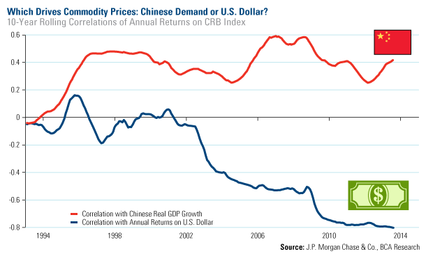 Eftersom vi inte kan skylla de svagare råvarupriserna på en minskad kinesisk efterfrågan, vad är det som fått dessa priser att falla? Titta på priserna i nedanstående diagram. Den röda linjen visar 10-års rullande korrelation mellan Thomson Reuters/Jefferies CRB Commodity Index (CRB) och Kinas reella BNP-tillväxt. Korrelationen mellan dessa två siffror har sedan slutet av 1990-talet uppgått till närmare 0,4.