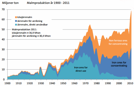 Aldrig har den svenska gruvnäringen producerat så mycket malm som den gjorde år 2011. Volymen icke järnmalm nådde upp till hela 36,9 miljoner ton och volymen järnmalm för anrikning nådde upp till 30,4 miljoner ton.