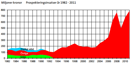 Intresset för att hitta nya gruvor är också fortsatt stort. År 2011 investerade gruv- och prospekteringsbolag nästan 800 miljoner kronor i Sverige, närmare bestämt 783 miljoner kronor. Under förra toppåret, år 2008 investerades ca 760 miljoner kronor.