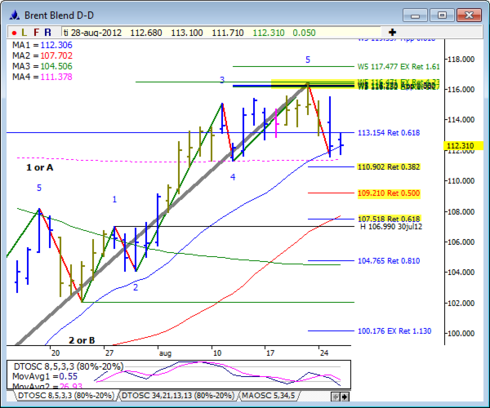 Olja var den 23:e augusti uppe vid en målzon, $116.1-117.5 som var vår mest sannolika zon, och har sedan sett vänt nedåt.