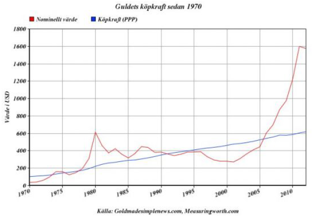 Dessa två grafer har sin utgångspunkt från år 1933, då guldet peggades till 35 dollar per uns till följd av president Roosevelts intervention. Guldets köpkraft har sedan härletts utifrån den inflationsutökning som ägt rum sedan dess.