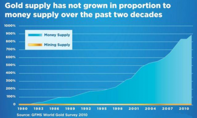 Illustration 1.) Denna graf visar hur pengamängden ökat under de senaste två decennierna, medan guldproduktionen legat stadigt. Under samma period har guldpriset ökat med cirka 600%. Det finns en tydlig koppling här. Om brytningen av guld hållit sig konstant, medan pengapressarna bara tycks ha ökat takten, så skapar det illusionen av att guld ökar i värde när det i själva verket är fiatvalutorna som urholkas i en allt tilltagande takt.