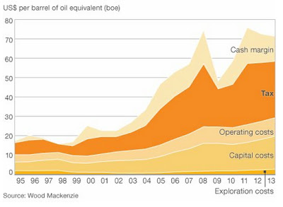 Notera att i diagrammet ovan så är skatter den utan konkurrens största kostnaden för oljebolagen. Regeringar runt om i världen kommer alltid att försöka dra nytta av de ökande vinster oljebolagen gör som en följd av sitt risktagande och sin kompetens. Ju högre rörelsemarginaler, desto högre beskattning. De övriga kostnaderna, till exempel driftskostnader, kapitalkostnader och prospekteringskostnader ökar stadigt över tiden, men i en takt som ligger betydligt närmare inflationen.