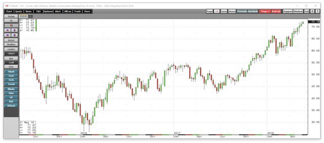 Som det veckovisa diagrammet för energiråvaror illustrerar har NYMEX råoljeterminer rusat till deras senaste topp på 72,30 USD per fat den 17 maj. Juliterminen, som är den nya frontmånaden handlades nära den nivån på måndagen den 21 maj vilket är nästan 72 procent över priset i juni.