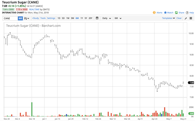 CANE är kortnamnet för den börshandlade fonden Teucrium Sugar ETF. Denna ETF har nästan 10,5 MUSD under förvaltning, och det omsätts cirka 47 000 andelar per dag. Denna börshandlade fond investerar i socker, mer korrekt i terminskontrakt på # 11 socker. I skrivande stund har denna ETF allokerat sitt kapital i lika stora delar till terminskontrakt som förfaller i oktober 2018, mars 2019 och mars 2020. Den an således anses utgöra en bra proxy för utvecklingen på sockermarknaden.