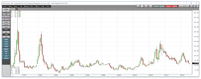 Kvartalsdiagrammet visar att 1985-låget var den absoluta botten för sockerpriset och att det har noterat en serie högre bottnar under åren och decennierna som följde nadiren. År 1999 sjönk sockret till 4,36 cent, en högre botten, under 2002 handlades det till 4,97 cent, i 2004 låg botten på 5,27 cent och i 2007 handlades socker till 8,36 vilket är ett pris vi inte har sett sedan dess.