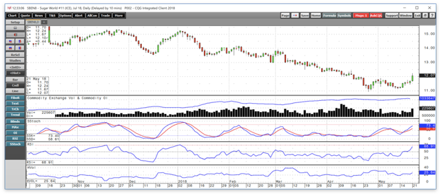Som diagrammet visar handlades socker i ett spann från 23 april till 11,89 per pound fram till fredag den 18 maj. På måndagen den 21 maj gick priset ut ur handelsbandet på uppåtgående betydande volymer vilket kan vara ett tecken på att priset på socker är låg och är nu i återställningsmodus. Det dagliga diagrammet visar att prismomentet har brutit genom och att en långvarig återhämtning pågår på sockermarknaden som fallit under vikten av ökande leveranser från Indien och Brasilien under de senaste månaderna.