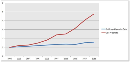 [quote]If we plot the price of gold against the entitlement spend in the U.S. Federal Budget, it is almost a 1:1 correspondence… /Colin Fenton, chefsstrateg med ansvar för råvaror hos JP Morgan[/quote]