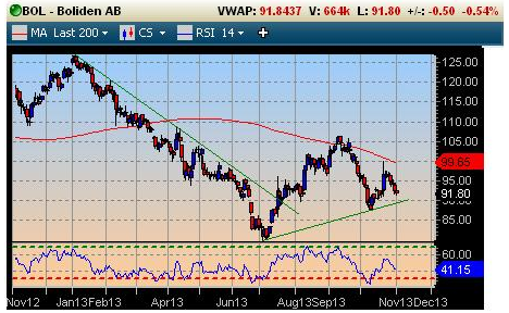 Efter en mycket svag inledning på året bröt Boliden-aktien den fallande trenden i juli och utvecklades därefter relativt starkt. Mot bakgrund av marknadsoron under september-oktober sjönk aktien tillbaka och handlas nu strax över 90 kronor. Vi bedömer att risk/reward är attraktiv i nuläget men föreslår att man handlar med stop loss.