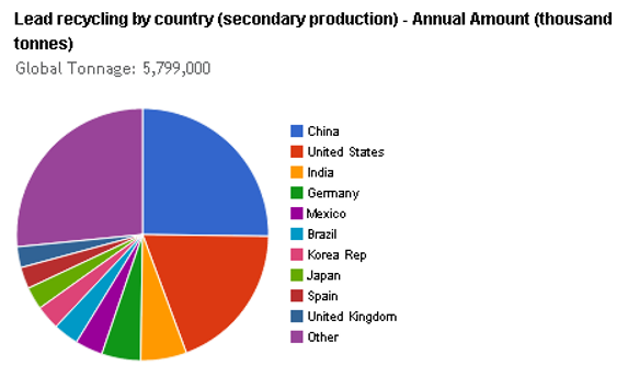 Den totala årliga blyproduktionen är cirka 8 miljoner ton, nästan hälften av detta tillverkas av återvunnet skrot – vilket gör bly till den mest återvunna metallen i absoluta volymer. Det är inte så pass konstigt med tanke på att 95 % av de använda blybatterierna i USA går till återvinning. I USA kommer mer än 80 procent av allt bly från sekundär smältning, medan samma siffra i Europa rapporteras uppgå till över 60 procent.