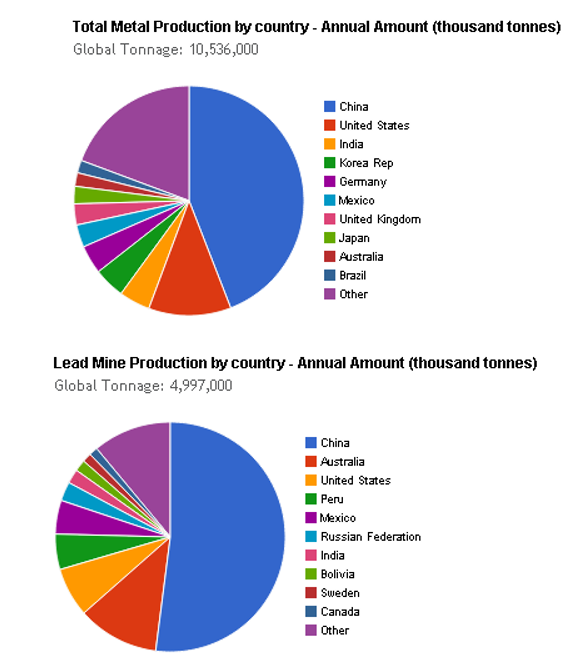 De största blyproducerande länderna är Kina, USA, Indien och Sydkorea. Kina, Australien och USA står för mer än hälften av primärproduktionen medan Mexiko är en stor aktör inom återvinning. Enligt International Lead Association bryts det årligen mer än tre miljoner ton bly, till ett totalt marknadsvärde om en miljard USD. Den globala marknaden för raffinerat bly uppgår enligt ILA till 15 miljarder USD, där mellanskillnaden utgörs av återvunnet bly.