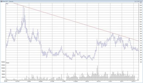 Den fallande trendlinjen har nu värdet 760 USD/bu och blir den första naturliga utmaningen i uppgången, även om redan 620 USD/bu är en hållplats på resan.