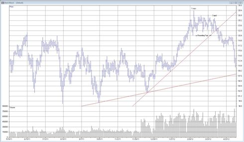 Dessutom hade oljan brutit under den stigande trendlinje som varit gällande sedan slutet av 2011. Och som ett tredje tecken på en kommande nedgång, såg vi att en så kallad ”rounding top” skapats under mars.