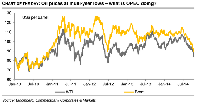 The oil market is gradually beginning to panic, as the two key oil prices have shed a further $3 since yesterday afternoon. Brent fell to a good $88 per barrel overnight, its lowest level since December 2010. WTI dropped to $83.5 per barrel and is thus the cheapest it has been since July 2012. Brent has plunged by 9% within the last two weeks and even by more than 20% as compared with its June high. The price slide has doubtless become more speculative in nature of late as the deteriorating global economic outlook, growing risk aversion and ample supply prompt more and more market players to bet on falling prices. The CFTC’s data due to be published this evening will only provide limited information given that they only reflect the week up to and including Tuesday. Iran added fuel to the flames yesterday when it followed Saudi Arabia’s lead and significantly lowered its prices as compared with international benchmarks. Just two days earlier, Iran had ruled out such a step. Thus the price war for market shares has entered its next round. This could hardly be a worse sign as far as OPEC’s external image is concerned. In difficult times, cooperation should really be the way forward. It will now be up to OPEC to halt the price slide by speaking out and, ultimately, by taking action. If OPEC maintains its passive stance, the market is likely to put OPEC’s pain threshold to the test. According to consultant firm Oil Movements, OPEC shipments are set to climb to a seven-month high in the four weeks to 25 October. This hardly sends out the right signal to the market even if Oil Movements does explain the increase by pointing to seasonally higher demand.