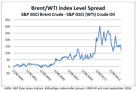 Dynamiken i oljehandeln har förändrats, något som är speciellt märkbart sedan 2010 när vi fick se en explosiv produktionstillväxt från skifferoljefälten i Texas och North Dakota. Vid samma tidpunkt kom den kanadensiska importen av olja till USA att öka kraftigt. Det ökade utbudet ledde till flaskhalsar och ett överutbud i oljedepåerna i Cushing vilket satte en prispress på WTI. Vi har sedan dess vid ett flertal tillfällen sett hur WTI, som egentligen är en råolja av en finare kvalité än Brent, handlas med rabatt mot Brentoljan. Nu har rörledningskapaciteten ökats och transporterna förbättras för att minska Brent-premien.