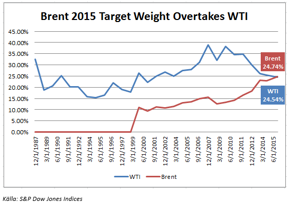 The S&P GSCI 2015 Rebalance Preview markerar ett historiskt skifte i den globala oljehandeln. Enligt det tillkännagivande som nyligen kommunicerades avseende re-balanseringen av indexvikterna kommer råoljan Brent att överta rollen som det ledande referenspriset för oljehandeln från WTI, West Texas Intermediate, och får den tyngsta vikten i råvaruindexet S&P GSCI. Det är därmed den första gången sedan 1997 som WTI inte är den viktigaste råvaran i detta index. Under perioden 1994 till och med 1997 hade naturgas en tyngre vikt än WTI.