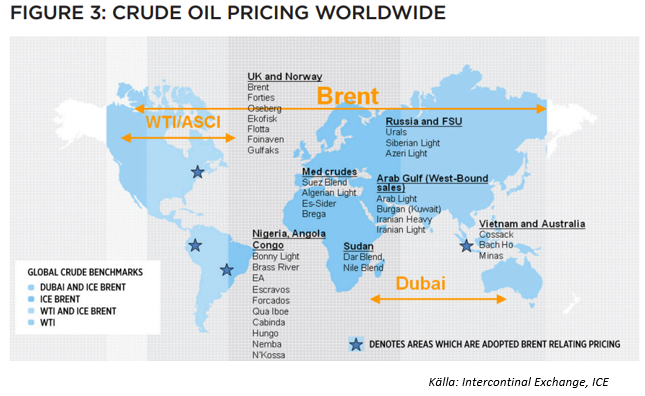 Nedan finns en karta som visar den ökade påverkan som Brentolja fått när det gäller att fungera som ett referenspris i prissättningen för oljehandeln.