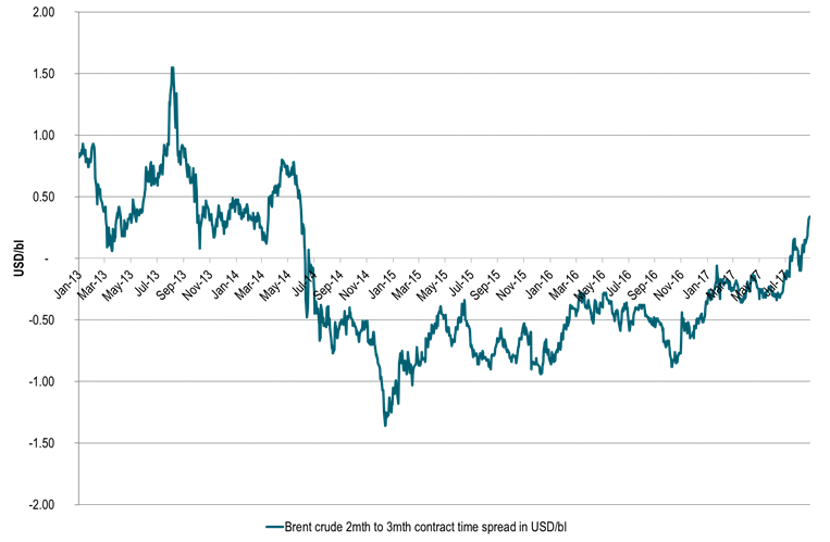 Thus the arrows are pointing to higher levels (also supported by technical indicators) with ytd high of $58.37/b within reach as we now traded at $57.2/b. However, Brent speculative positions are getting stretched. Thus we will get a correction down the road. What the trigger might be is hard to say. An equity correction in combination with a USD rebound/rally (October and November usually strong dollar months), emerging market risk-off as well as a possible increasing concern for whether OPEC+ will roll forward its cuts beyond 1Q18 could be the outline for such a correction. The current steepening Brent backwardation would then get at setback as well. But as of now we are heading higher but beware of the of the altitude.