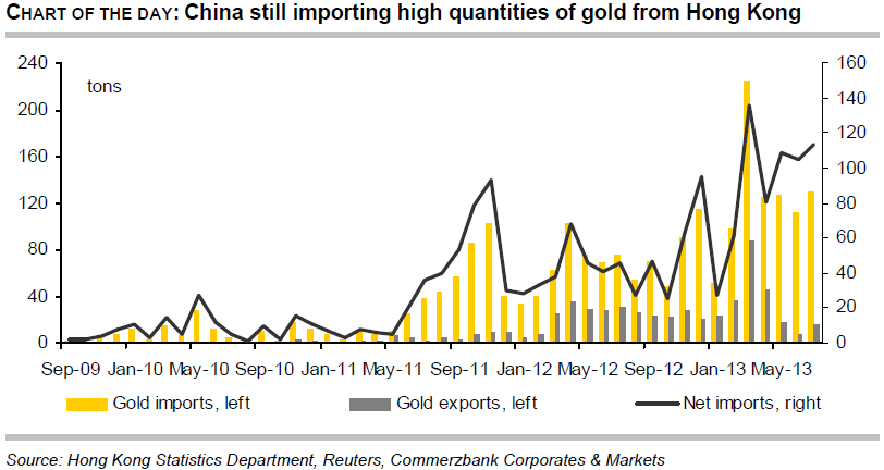 Positive US economic data, a firm US dollar and an increase in US bond yields to 3% caused the gold price to fall to a two-week low of $1,365 per troy ounce yesterday. As expected, the ECB has left interest rates unchanged. As ECB President Draghi announced at the press conference, however, the ECB Council did discuss lowering rates, though our economists do not believe there is any economic justification for doing so. China’s appetite for gold meanwhile still appears undiminished. In July, the country imported 129.2 tons of gold from Hong Kong, making this the third consecutive month in which China imported over 100 tons per month. At 113.2 tons, net gold imports were more than twice as high as last year. Since the beginning of the year, China has imported 631 tons of gold net from the former British Crown Colony, thus already significantly exceeding last year’s total import volume (555.2 tons). China thus remains the key driver of gold demand, and is also able to offset the weak investment demand to some extent. What is more, this is further evidence of the shift in gold demand from West to East. In South Africa, some movement is now evident in the pay negotiations. By its own account, the NUM union has received an improved offer from employers, though it has not released any details. According to media reports, NUM had previously lowered its demands, though the strikes will continue for the time being. Meanwhile, two smaller gold mining producers have agreed with the union on pay rises of as much as 8%.