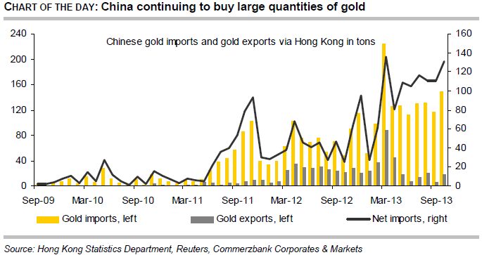 Gold is trading at around $1,245 per troy ounce this morning and is thus profiting hardly at all from what are once again extremely robust Chinese import data. According to figures from the Census and Statistics Department of the Hong Kong government, China imported 131.2 tons of gold net from the former British crown colony in October. This is five times more than the previous year’s figure and only five tons below the record net import volume achieved in March. China has thus imported more than 100 tons of gold from Hong Kong for the sixth consecutive month. Since the start of the year, net imports have totalled 987 tons, meaning that China is very close to exceeding the 1,000 ton mark. The very high imports are primarily an expression of China’s undiminished appetite for gold. Traders and jewellers continue to seize every opportunity to buy gold in response to noticeably increased demand among retail investors for jewellery, coins and bars in the wake of the price fall. With the season of highest demand just around the corner, China can be expected to import large quantities of gold in the coming months too. Part of the gold imports may also be attributable to some Chinese banks trying to meet their import quotas before the year’s end, however, as they risk being assigned lower quotas by the central bank next year if they do not fully use up this year’s quota. In any case, China is hoovering up the gold made available as a result of the ETF outflows, which probably means it has been removed from the market long-term.