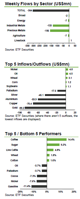 Profit taking drives US$7mn of outflows from long coffee ETPs. Prices have been rising on the back of fears that continued dry weather in Brazil, the biggest producer, might negatively impact next year crop. Brazil’s worst drought in decades saw Arabica coffee prices soaring 88% since the beginning of the year.