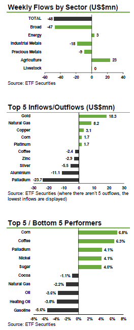 Price gains in industrial metals attracted flows into copper, while driving profittaking elsewhere. With the exception of tin, all industrial metal prices rose last week. ETFS Copper (COPA) received its first inflow in six weeks. Meanwhile profit taking saw US$11.1mn of outflows from ETFS Aluminium (ALUM), adding to the US$59.9mn of outflows the previous week, reversing all of the strong inflows we saw in July and August. ETFS Zinc (ZINC) saw US$2.9mn of outflows, the largest in eight weeks.