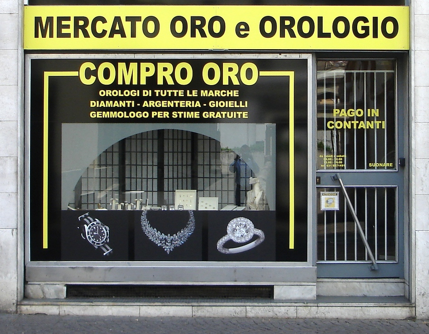 Många av affärerna är pantbanker. Till skillnad från norra europa där pantbanker köper och säljer alla möjliga saker så är det guld som står i fokus i Italien. Vilket delvis har sin förklaring i att det i Italien finns en större tradition av att ge guld i present vid viktiga livshändelser, vilket gör att den genomsnittlige italienaren helt enkelt har mer guld i byrålådan än nordeuropéer.