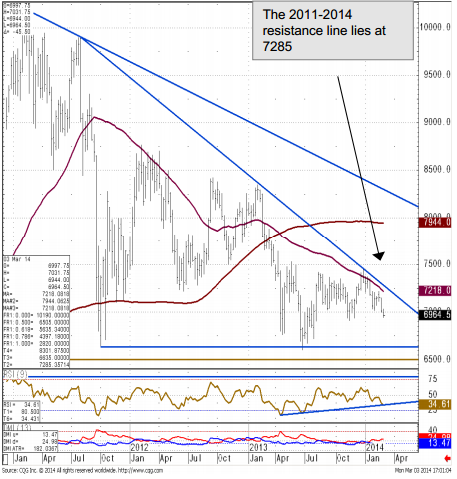 - Directly above here, resistance extends to 7534 (May 2013 high) and while capped here, the late July low at 6721 will continue to be targeted.