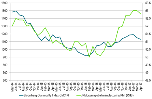 The discussion is going left, right and centre for explanations of why we have such a sharp sell-off in commodities in general and oil specifically. Is the macro backdrop deteriorating? The decline in US consumer confidence by 5 points from March to April as well as a topping over of the global manufacturing PMI at the same time might have been a queue to macro driven investors to take profits on commodities in general. The general view is however that the macro backdrop is fine. That US Q1 growth weakness is transitory and that Chinese infrastructure contractor order intake was strong in Q1-17. Chinese tightening liquidity settings aiming to prevent overheating and too much speculative activity is probably a part of the reason for the sell-off in metals. As such it seems like there is a disconnect between the general macro-view which looks overall positive and the current commodity sell-off which is blood red. Graphing global PMI to commodities does however paint a picture of a fairly good relationship. Is the commodity sell-off an indicator that the somewhat rosy macro view is wrong? Probably not seems to be the main view so far.