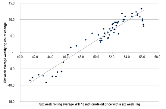 Ch4: Relationship between US mid-term WTI forward prices and weekly US oil rig additions