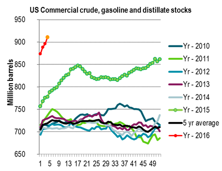 The API thus saw in its partial data set reported by its members a much stronger rise than what was consensus in Bloomberg yesterday. Usually the API data are in the ball-park correct. So do expect a solid rise in US inventory data today at 16.30 CET. As we have stated before, if global inventories outside of the US are starting to struggle to store more oil, then a major part of the running global oil surplus needs to be stored in the US. Assuming a running surplus of 1.5 mbpd on average in H1-16 it would indicated that US oil inventories could rise by some 10 mb per week. Total US crude and product inventories have risen by 5.5 mb per week on average during the last 10 weeks, but has average 9.9 mb per week the last 4 weeks. During the first 10 weeks of the year US total oil inventories normally rise by some 1.1 mb per week and by 2.4 mb per week the first 5 weeks of the year.