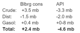 In last week’s data release we saw that the net increase of crude, gasoline and distillates only came in at a +1.8 mb gain. That was the lowest gain since late December since which the average weekly gain has been running at about +10 mb per week. The Bloomberg consensus for today’s US oil inventory data released points to a total rise of 2.4 mb. The partial data set aggregated by API from its members in the US oil space did however point to a solid total decline of 4.6 mb with a significant decline in US crude stocks as well as distillates: