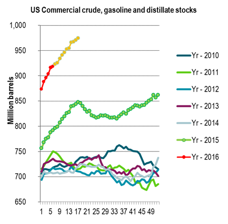 Today we will have the publishing of US oil inventory data at 17.00 CET. Since the start of August last year total commercial US crude and product stocks have increased by 102 million barrels. During that period we have only seen 5 weeks with declines in the net change in stocks constituted by crude + gasoline + distillates. The general take has been that the US holds a substantial capacity of the yet remaining free storage capacity for oil globally. Thus not surprisingly that has also been where we have seen the solid accumulation in oil inventories. The US is a huge net importer of oil, still the second biggest oil importer in the world. Thus when we see consistently increasing oil inventories in the US it basically means that the US is importing more oil than it needs. This has of course been impacted by logistical issues within the US regarding location of production versus consumption and crude qualities and refinery specs in combination with the earlier crude oil export ban.
