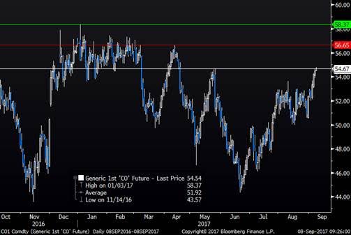 All since the end of July we have seen Brent crude trading fairly range bound between $50/b and $53.64/b. This week it broke upwards out of this trend. Brent crude hit an intraday low of $50.58/b last Wednesday on the fear that Hurricane Harvey would disrupt U.S. Gulf refineries’ consumption of crude oil for a lengthy period of time. I.e. lower refinery activity would give lower crude consumption and thus lower crude prices. When refineries gave signals that damage was not too great and restarts were on the table then Brent crude rose back up and then continued higher.