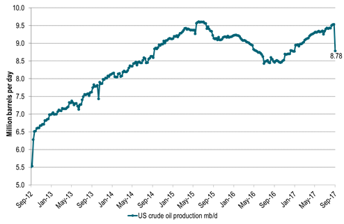 While the fear last week was for reduced oil processing by refineries due to hurricane Harvey, the coin has now flipped. Now the concern is that this may be a heavy hurricane season with the risk of substantial disruptions to crude oil production in the Gulf of Mexico. The US EIA yesterday reported that US crude oil production last week was down 749 kb/d WoW to 8,781 kb/d which is the lowest since December last year.