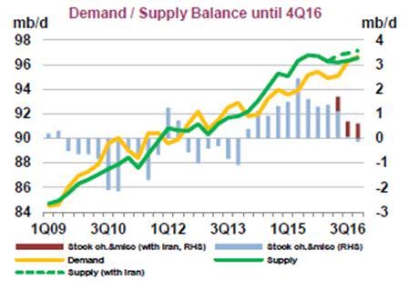 Demand growth likely to revert to long term trend in 2016 after a boost to oil demand growth in 2015 due to a steep y/y fall in oil prices it said. Global market to remain in surplus despite falling US production.
