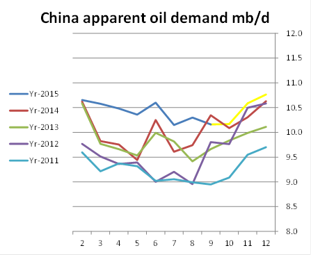 This places ytd y/y demand growth indicatively at 4.6%. If we extrapolate the rest of the year with the average m/m growth rates for the last 4 years we get a projected total 2015 y/y China oil demand growth of 3.8%. SEB’s latest projected China oil demand growth (Aug) for 2015 stood at 5% which may now look too high.