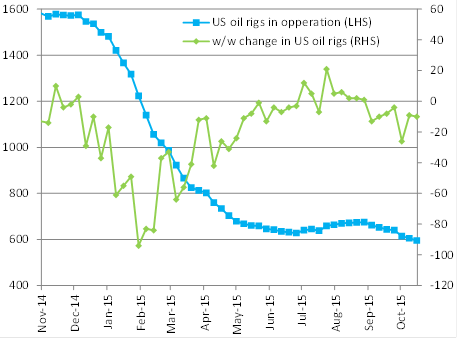 Brent crude fell back 4.6% last week to $50.46/b. The sell-off started Friday the week before and then accelerated at the beginning of last week. This time it was not about the USD which actually weakened over the period. News last Monday from OPEC that its September oil production reached the highest level in three years (31.57 mb/d) probably helped to push the price down. A solid rise in US crude oil stocks (+7.6 mb) and fairly bearish oil market reports from IEA and EIA (oil market in surplus throughout 2016) added bearish sentiment during the week. Chinese imports (total economy) falling 17.7% y/y in September did not help on the sentiment either. Industrial metals were mixed but overall down 0.7% last week. This morning Brent crude is down 1.2% to $49.9/b with industrial metals also in the red both oil and metals obviously unimpressed by slightly better than expected China Q3 GDP growth of 6.9%. Disappointing this morning is China apparent oil demand falling 1.8% y/y in September. Still falling US rig count on Friday (US oil rigs down 10 to 595) has not yet been able to push the price higher this morning.